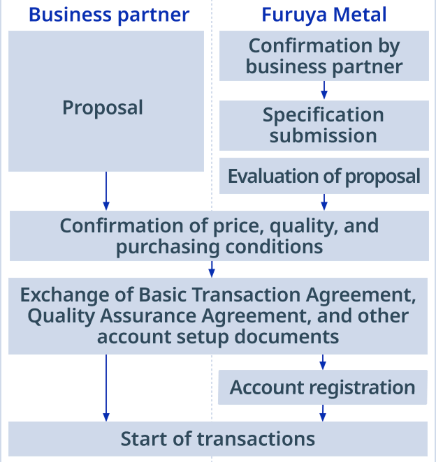 Procurement transactions at Furuya Metal are, in principle, conducted based on written contracts. For ongoing business relationships, the Company typically concludes a Basic Transaction Agreement, and, to ensure quality and safety, a Quality Assurance Agreement is also signed as standard practice.