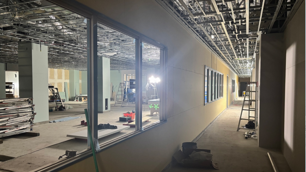 本格化し、間仕切り壁下地工事が始まる。